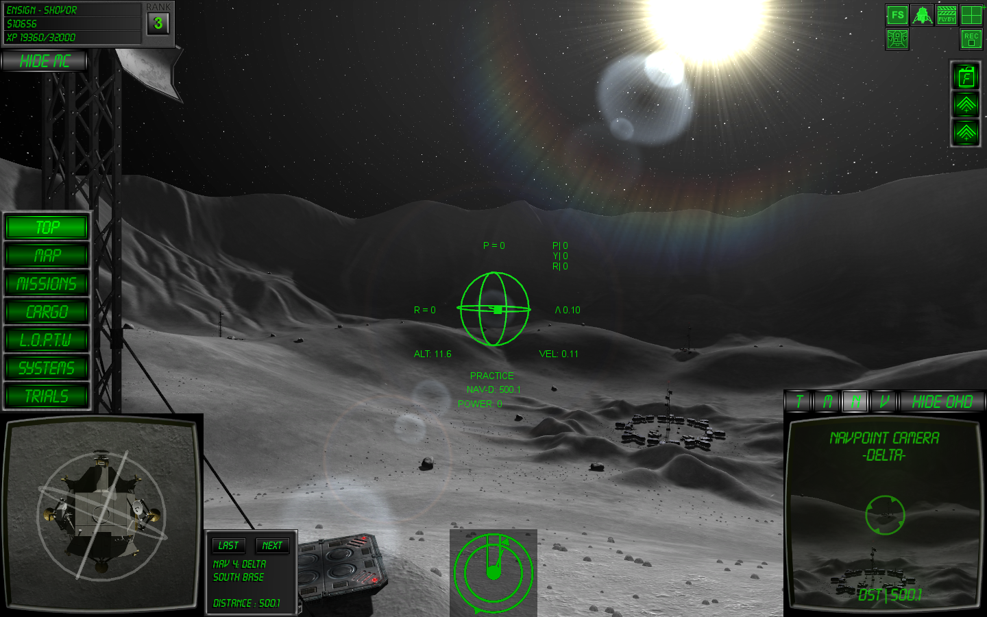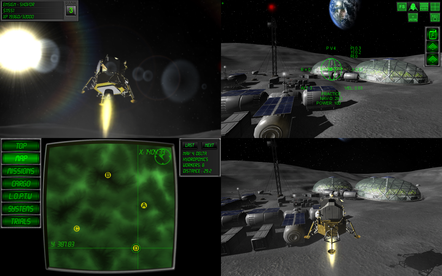 Explore the most realistic and beautiful realtime simulation of 'Lunar Flight' in this unique and challenging game. Experience the heart pounding sense of dread as you deliver supplies to moon bases with only seconds of fuel to spare! A modern take on the classic arcade game, Lunar Lander, Lunar Flight extends the experience to a fully fictionalized and accessible lunar module simulator providing a variety of mission types involving transporting cargo, acquiring data at survey locations and locating lost cargo.History